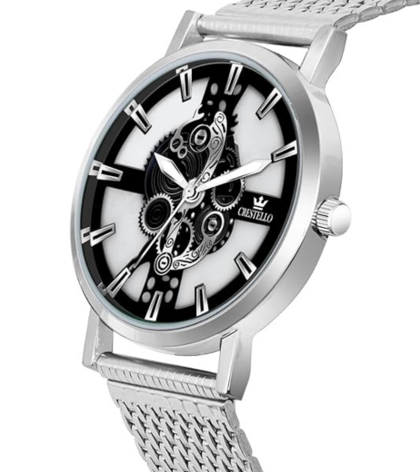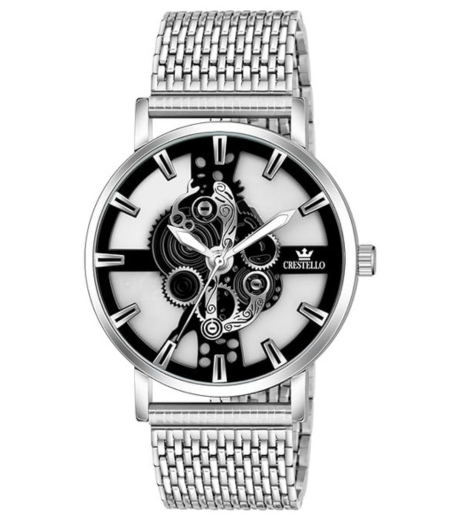 Crestello Silver Stainless Steel Bracelet Watch With a Black And White Skeleton Dial